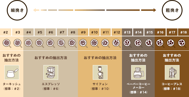 抽出する器具に合わせた挽き方をご指定頂くことが、コーヒーを美味しく抽出する近道といえます。