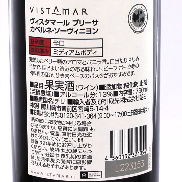 チリ産赤ワイン・ビスタマール・ブリーザ カベルネ・ソーヴィニヨン 750ml×12本 辛口 ミディアムボディ 送料無料