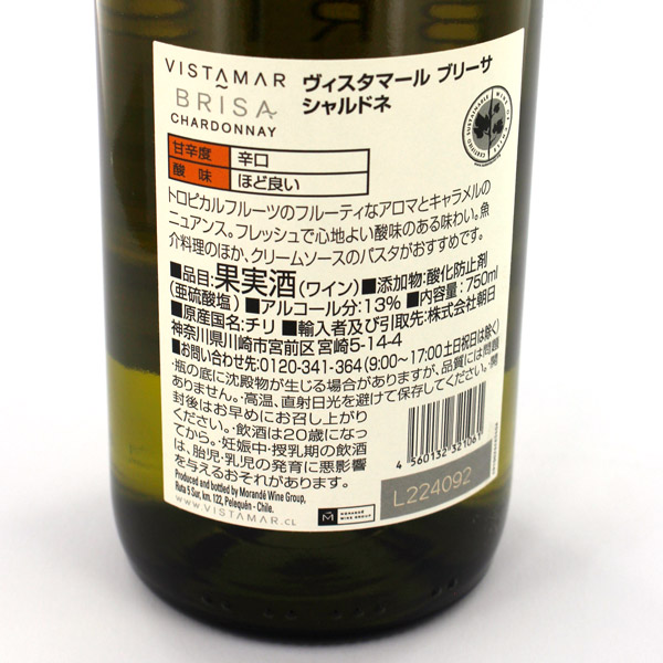 チリ産白ワイン・ビスタマール・ブリーザ シャルドネ 750ml×12本 送料無料