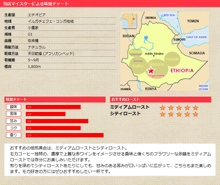 おすすめの焙煎度合は、ミディアムローストとシティロースト。 モカコーヒー独特の、濃厚で上質な赤ワインをイメージさせる香味と後くちのフラワリーな余韻をミディアムローストでは存分にお楽しみいただけます。 煎りを深めてシティローストあたりにしても、甘みのある苦味が口いっぱいに広がって、こちらもまた楽しめます。