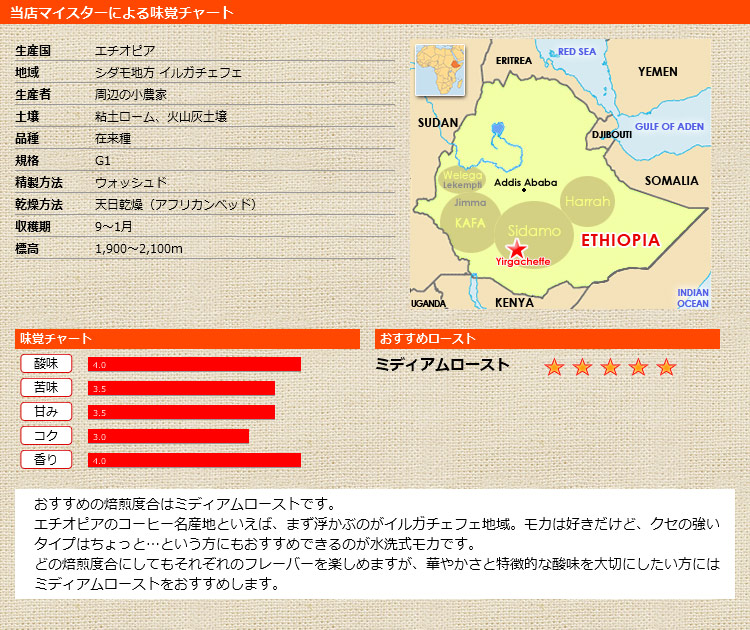 おすすめの焙煎度合はミディアムローストです。 エチオピアのコーヒー名産地といえば、まず浮かぶのがイルガチェフェ地域。モカは好きだけどクセの強いタイプはちょっと…という方にもおすすめできるのが水洗式モカです。 どの焙煎度合にしてもそれぞれのフレーバーを楽しめますが、華やかさと特徴的な酸味を大切にしたい方には、ミディアムローストをおすすめします。