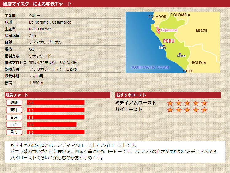 ペルー北部の農家さんの個人名が付いたこちらの『 マリア ニエベス 』は、ティピカ種とブルボン種を、高品質コーヒー作りの指導のもとに毎年レベルアップして磨き上げてきた、おすすめのコーヒーです。