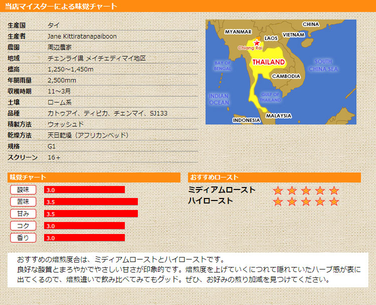 - 品種:カトゥアイ、ティピカ、チェンマイ、SJ133