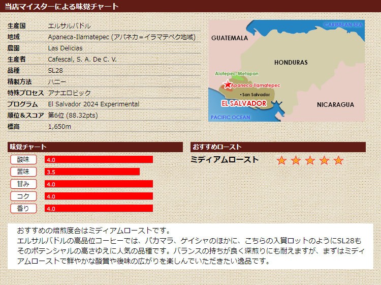おすすめの焙煎度合はミディアムローストです。 エルサルバドルの高品位コーヒーでは、パカマラ、ゲイシャのほかに、こちらの入賞ロットのようにSL28もそのポテンシャルの高さゆえに人気の品種です。バランスの持ちが良く深煎りにも耐えますが、まずはミディアムローストで鮮やかな酸質や後味の広がりを楽しんでいただきたい逸品です。