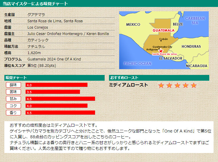 最高の中の最高のコーヒーを選ぶ「カップ・オブ・エクセレンス 2024 グアテマラ」に見事に選ばれたコーヒーが届きました! One Of A Kind部門で第5位に入賞のロス コネホス農園による、トロリとした甘さと重厚なコクの余韻がある一杯です。