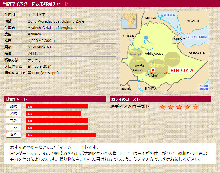 おすすめの焙煎度合はミディアムローストです。 東シダモにある、あまり馴染みのないボナ地区からの入賞コーヒーはさすがの仕上がりで、繊細かつ上質なモカを存分に楽しめます。 贈り物にもたいへん喜ばれるでしょう。ミディアムでまずはお試しください。