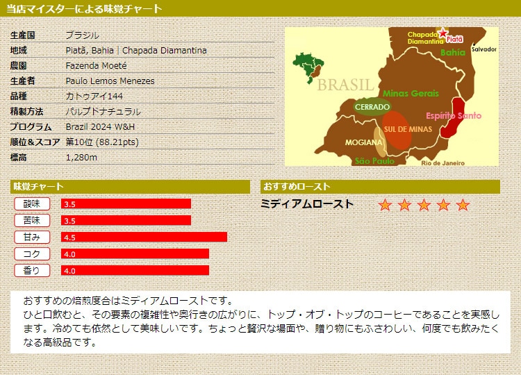 最高の中の最高のコーヒーを選ぶ「カップ・オブ・エクセレンス 2024 ブラジル」に見事に選ばれたコーヒーが届きました! W&H部門で第10位に入賞の、まろやかな甘さにコクの余韻が印象的な「モエテ農園」です。