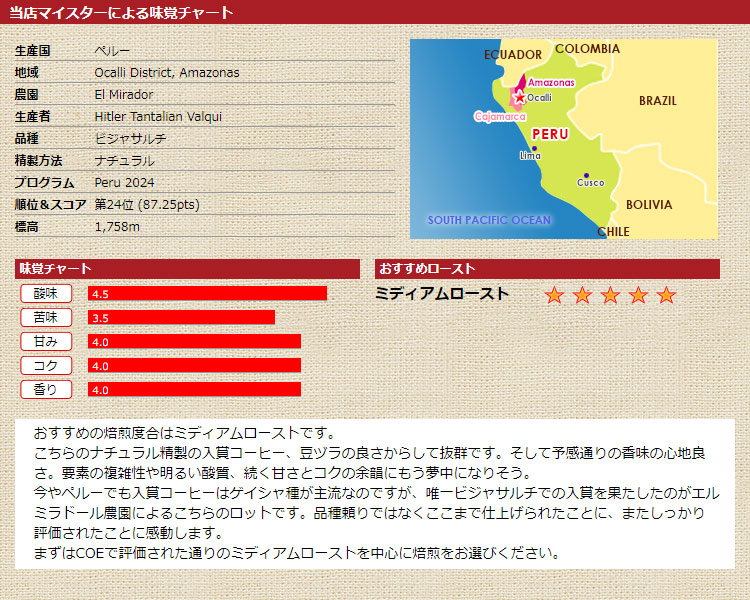 最高の中の最高のコーヒーを選ぶ「カップ・オブ・エクセレンス 2024 ペルー」に見事に選ばれたコーヒーが届きました! 明るい酸味や上品な渋み、甘さとコクの余韻が特長の「エルミラドール農園」です。