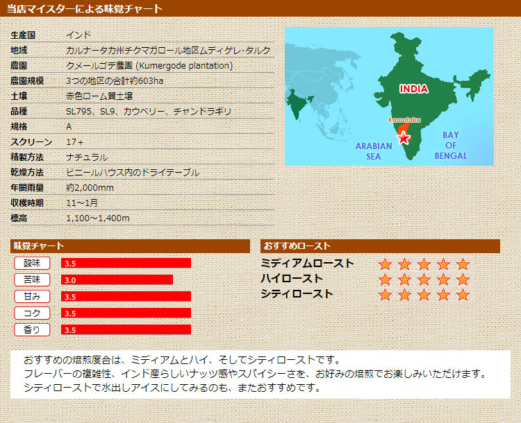 おすすめの焙煎度合は、ミディアムとハイ、そしてシティローストです。 フレーバーの複雑性、インド産らしいナッツ感やスパイシーさを、お好みの焙煎でお楽しみいただけます。 シティローストで水出しアイスにしてみるのも、またおすすめです。
