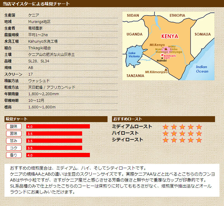 おすすめの焙煎度合は、ミディアム、ハイ、そしてシティローストです。 ケニアの規格AAとABの違いは生豆のスクリーンサイズです。実際ケニアAAなどと比べるとこちらのカフンヨ ABはやや小粒ですが、さすがケニア産だと感じさせる芳香の強さと鮮やかで重厚なカップが印象的です。 SL系品種のみで仕上がったこちらのコーヒーは深煎りに対してももろさがなく、焙煎度や抽出法などオールラウンドにお楽しみいただけます。