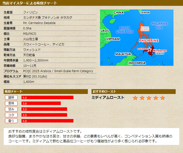 フィリピンのコーヒー栽培の歴史は長く、スペイン領だった18世紀の半ばに導入されました。首都マニラがあるルソン島の北部コーディリエラ行政地区の各州にはアラビカ種の生産地域が広がっています。超小規模農家が伝統的製法でコーヒーを精選・乾燥し、主に水洗式で仕上げています。今回当店が販売しますオークションコーヒーは、フィリピン南部のミンダナオ島ブキドノン州からエントリーされ、入賞を果たしました。スクリーンサイズ14〜15が中心の、とても丁寧に仕上がっているジューシーな逸品です。