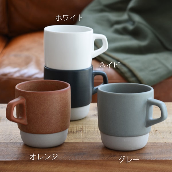 手触りのよい土肌とマットな釉薬のコンビネーション。グレイッシュな色土とダークトーンのカラー釉薬が織りなすかすれた風合い、白磁に施したホワイトカラーの白の清さ。収納性に優れたスタッキングしやすいデザインのマグカップです。