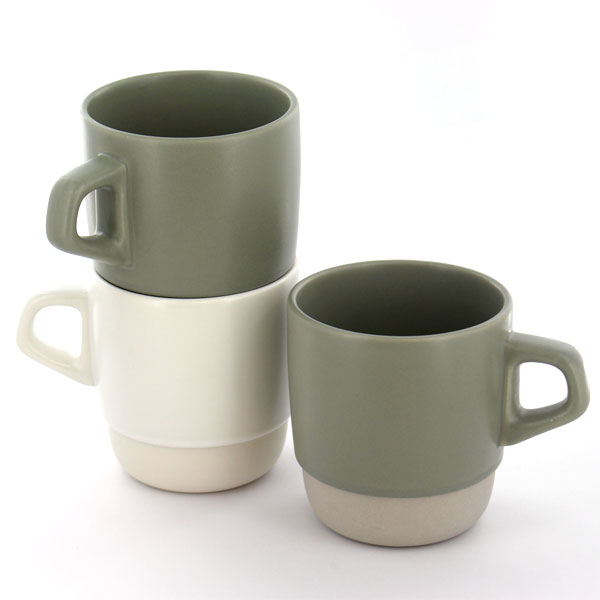 手触りのよい土肌とマットな釉薬のコンビネーション。グレイッシュな色土とダークトーンのカラー釉薬が織りなすかすれた風合い、白磁に施したホワイトカラーの白の清さ。収納性に優れたスタッキングしやすいデザインのマグカップです。