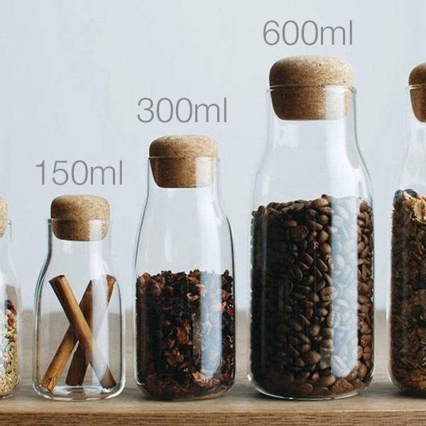 並べておくだけでもインテリアとして映えるデザインの耐熱ガラスとコルクを組み合わせたボトル型キャニスターです。