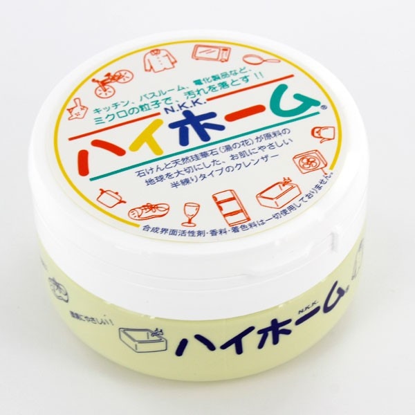 「ハイホーム」は天然のケイ酸の華(湯の花)に、ヤシ油使用の高品質石ケンを配合した、自然派のクレンザーです。 昭和38年の製造当初より、有害性が心配される高級アルコール・リン酸塩・合成界面活性剤・蛍光剤・着色剤・香料などを一切使用しない独自の製法で、人や環境にやさしい洗剤です。