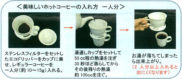 (ペーパーフィルターに比べ、油分を取られないのでコーヒー本来のコクが楽しめます)