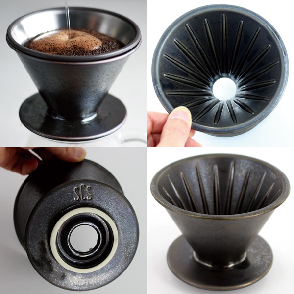 ステンレスフィルターで淹れるコーヒーは、旨み成分であるコーヒーオイルを多く抽出し、コーヒー本来のアロマをダイレクトに味わえ、ペーパーフィルターでは、クリアでマイルドなコーヒーの飲み心地を愉しめます。底面には大きめの一つ穴が空いており、円錐形のSCSステンレスフィルター、SCSコットンペーパーフィルター、いずれもセットして使うことができます。