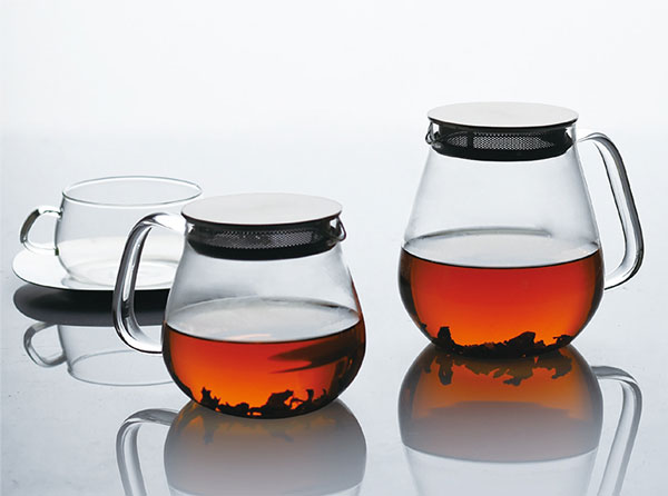 ステンレスの蓋とストレーナーが一体となった、ワンタッチティーポット。ガラスのジャグに茶葉を入れてお湯を注ぎ、ふたをしてそのまま注げば、おいしいお茶がはいります。ストレーナーで漉すのではなく、丸いポットのなかで茶葉をゆったりと開かせながらジャンピングさせるので、お茶本来の味をひきだすことができます。