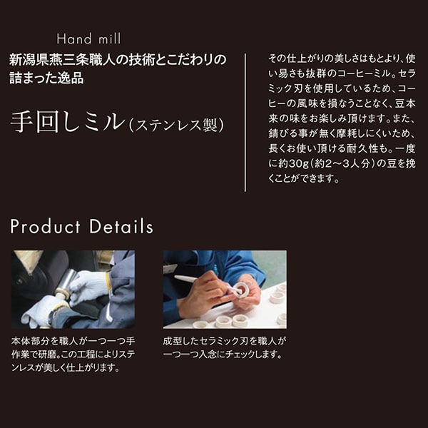 ハンドミルのこだわりであるセラミック刃、本体ステンレスは丁寧で確かな日本の職人によって創られています。