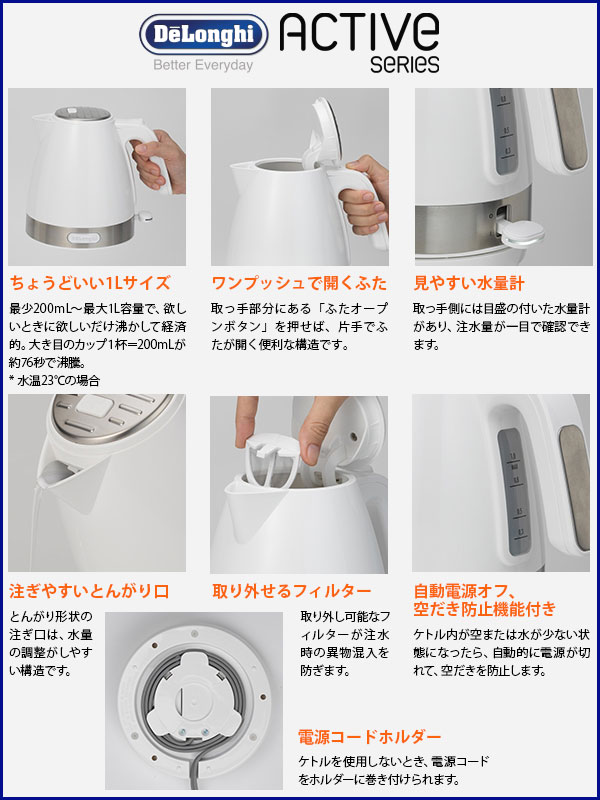 デロンギ 電気ケトル 1L アクティブ シリーズ ホワイト KBLA1200J-W