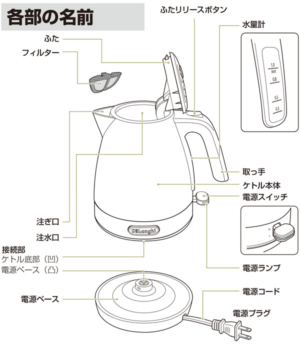 ワンプッシュふた、水量計、自動電源OFF機能、空だき防止機能、フィルター