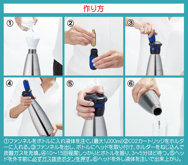 ご家庭で水やジュース、アルコール飲料などをお手軽に炭酸飲料にすることができます。