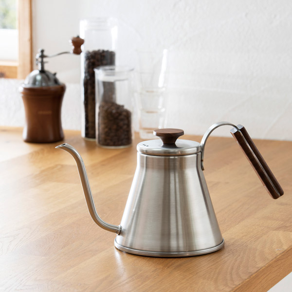 ハンドルとフタのツマミを天然木にして温かみのある雰囲気に仕上がった、ハリオのV60ドリップケトルです。