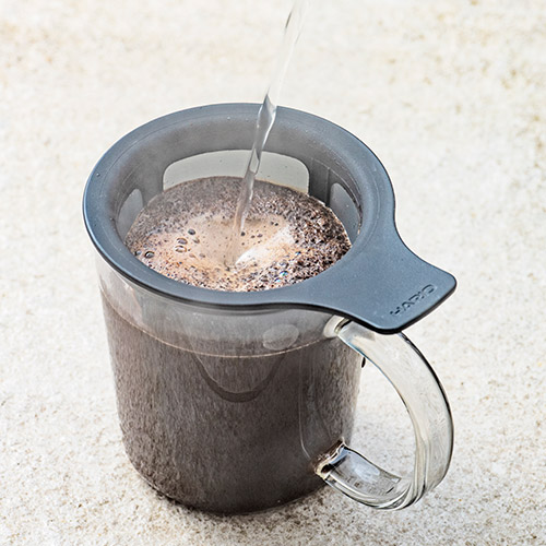 美味しさを実現するこだわりのメッシュフィルターは繰り返し使っても汚れの目立ちにくいブラックカラーです。 ストレーナーは裏返したフタの上に置くことができます。
