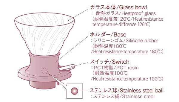 材質:耐熱ガラス、シリコーンゴム、ステンレス球、PCT樹脂
