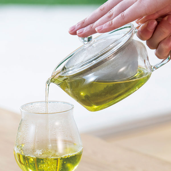 美味しいお茶を淹れるために、ガラスの形状に沿う大きな茶こしで茶葉の旨味をしっかり抽出します。