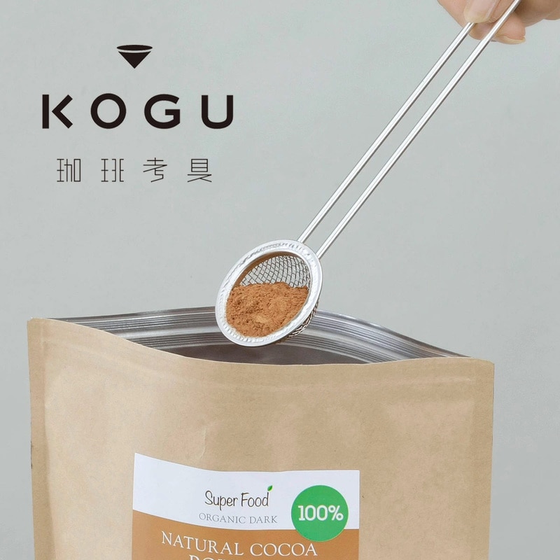 ココアの袋からすくって、そのままカップの上で振れるメッシュスプーンです。