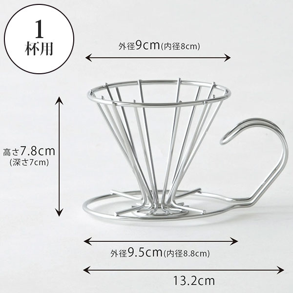 フィルターは2〜4杯用を折って使います。ドリッパーはカップの上に直接セットします。1人分でも香り引き立つ美味しいコーヒーが淹れられます。 ワイヤーフレームだからすき間からドリップした量が見れます。すき間から見れる事で適量でドリップを止められます。円すい型・台形どちらにも対応。