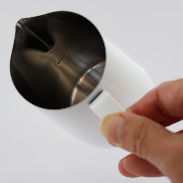 人気の細かい柄が描きやすいシャープスパウト仕様で、ラテアートに最適なピッチャーです。 上部が斜めにカットされていることで、ミルクの流量がコントロールしやすくなっています。 内部に刻まれた目盛りで、1杯のカフェラテを作るのに最適な180ccのミルクを測ることができます。 細いラインを描くのに適したシャープな注ぎ口です。