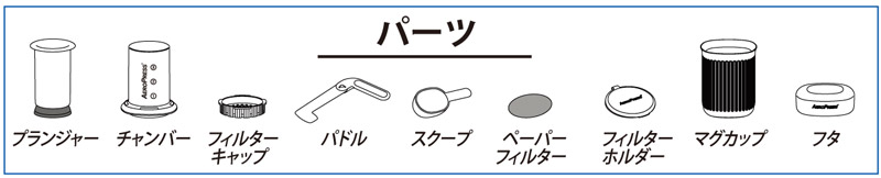付属品:チャンバー、プランジャー、マグカップ、リッド、ペーパーフォルダー、キャップ、ヘラ、スプーン、ペーパーフィルター(350枚入)