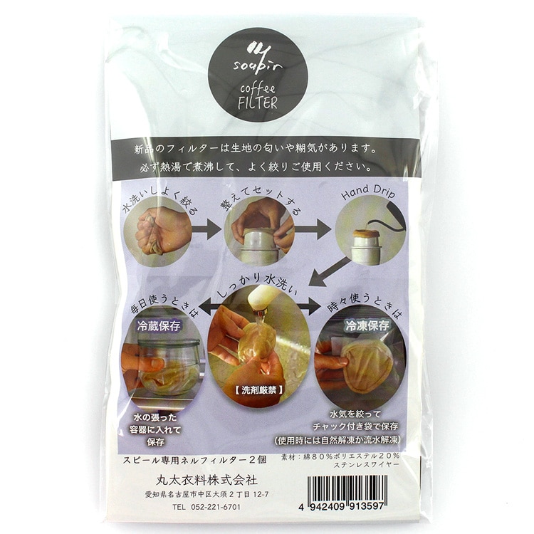お使いの後は洗剤を使わずに水洗いをし、毎日使われない方はジップロック等に入れて冷凍、毎日使われる方は水に浸けて冷蔵保管をおすすめします。この保管方法は布の劣化を遅らせる効果があります。布地に染み込んだコーヒーオイルは、乾燥すると酸化し、布の腐食を早める原因となりますので、【乾燥させないこと】【洗剤を使わないこと】の2点にお気を付けください。使用回数は50回を目安にしていますが、布から匂いがした場合はお取替えください。時折煮沸しますとより長持ちします。 基本的にはペーパードリップの紙が布になったのみですので、上記2点に気をつけていただければペーパードリップに慣れている方であれば難しいことは特にありません。お気軽に楽しんでいただけると幸いです。