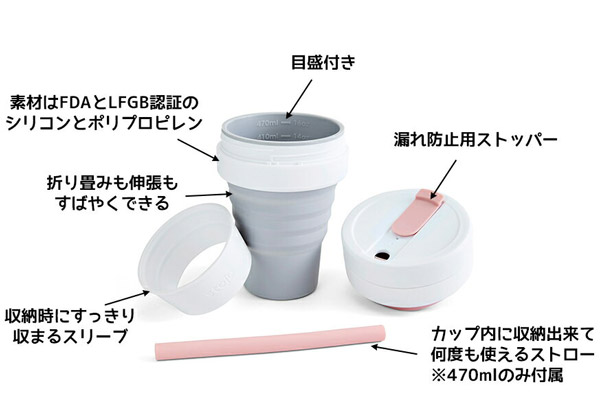 ※飲み物を入れた状態でカップを折り畳んだり潰したりしないでください。