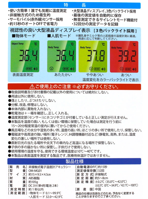 ※本品は表面温度を測定する製品です。医療用体温計ではありません。