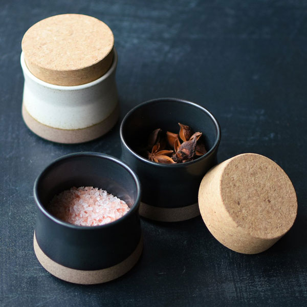 素朴な土の質感と味わいある釉薬、温かみのあるコルクの組み合わせ。キッチンやテーブルで映えるデザインです。