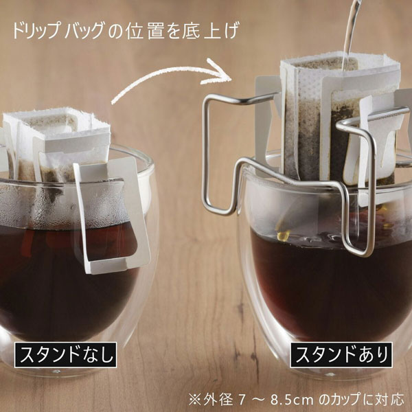 スタンドをセットするだけで、ドリップバッグがコーヒーに浸かることなくドリップできます。ドリップバッグを底上げすることにより、コーヒーに浸かることなくドリップすることができます。