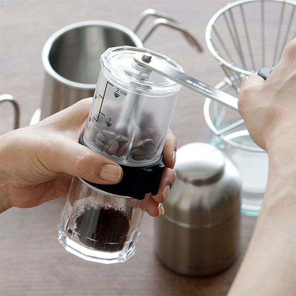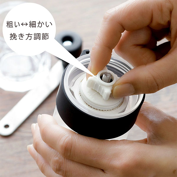 分量の目安となるコーヒー豆の目盛り付き!お好みの豆を目盛りまで入れてあとはクルクル回すだけ。 ミル部はセラミックで、金属臭がなくコーヒー本来の風味を損ないません。 また摩耗しにくい為、使い始めの挽き具合が持続します。 粗さ調節ネジでドリップ方式に合わせた粗さを選べます。 セラミックミル部は取り外し、水洗いができます。 目盛りは浅煎り・中深煎りと分かれています。