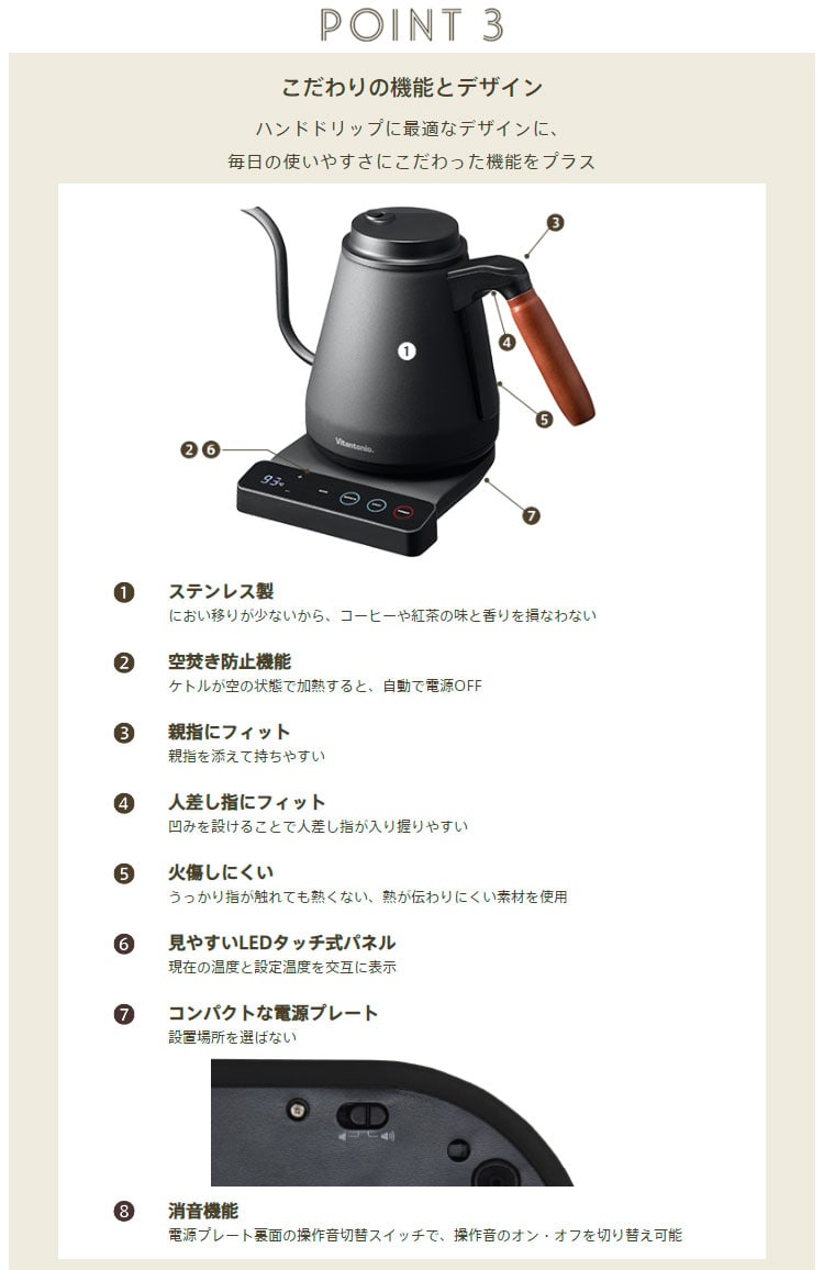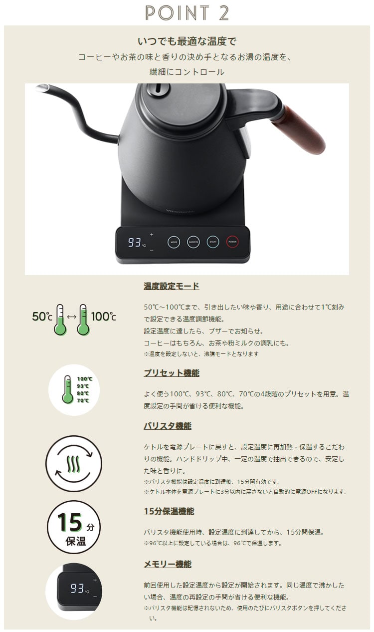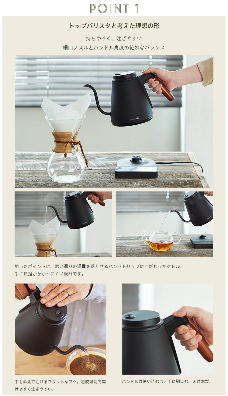 自分好みの一杯を淹れるための、細口ノズルとハンドルの絶妙なバランス、細かな温度調節とこだわりの「バリスタ機能」で、 コーヒーの味と香りをもっと引き出す理想のケトルです。