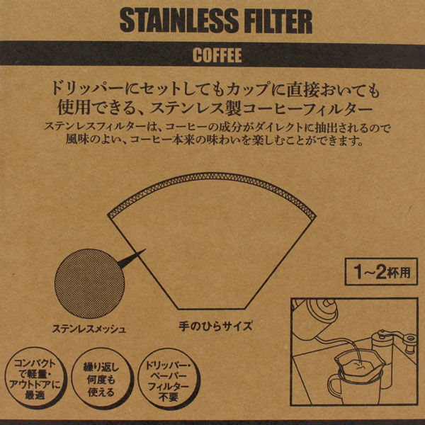 フォルダブル(折りたためる)ステンメッシュコーヒーフィルターです。 ドリッパーにセットしても、カップに直接置いても使用出来ます。 ステンレスフィルターは、コーヒー本来の味わいを楽しむことができます。