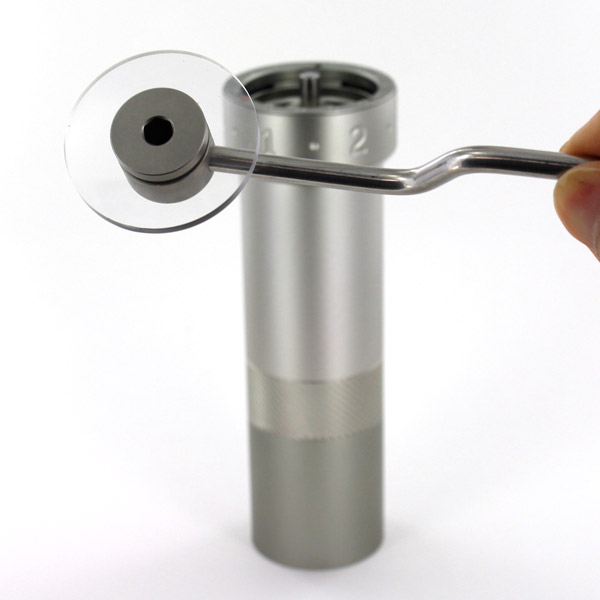 軸受に金属ベアリングを採用することで、回転部分の精度が上がり、鋭いステンレス刃のブレを抑え精度の高い粉砕能力を実現しています。またアルミ合金製のボディで強度と軽さを両立させています。 コーヒー豆の投入はハンドアームを外して行いますが、フタ部分が透明なポリカーボネートになっており、豆の挽いた残量を上から確認できる構造になっています。