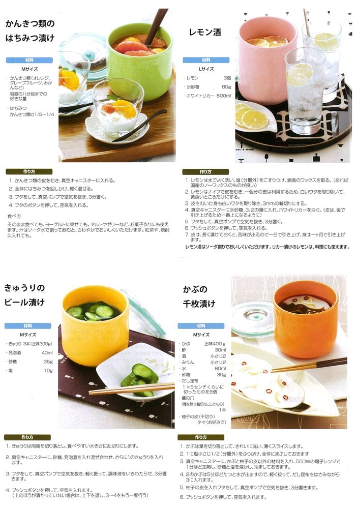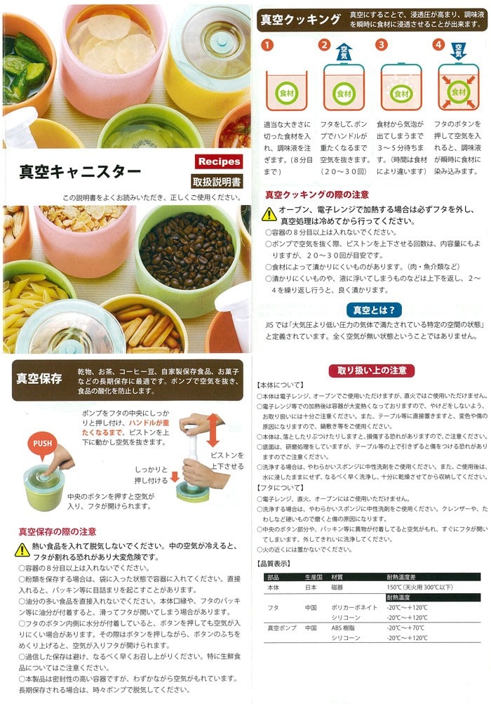 キャニスター専用の真空ポンプで20〜30上下すると容器内部の空気を抜き容器内の圧力を下げ真空状態にすることができます。 フタをあける際には、フタの中心部のボタンを押す事で空気が入り簡単に開きます。