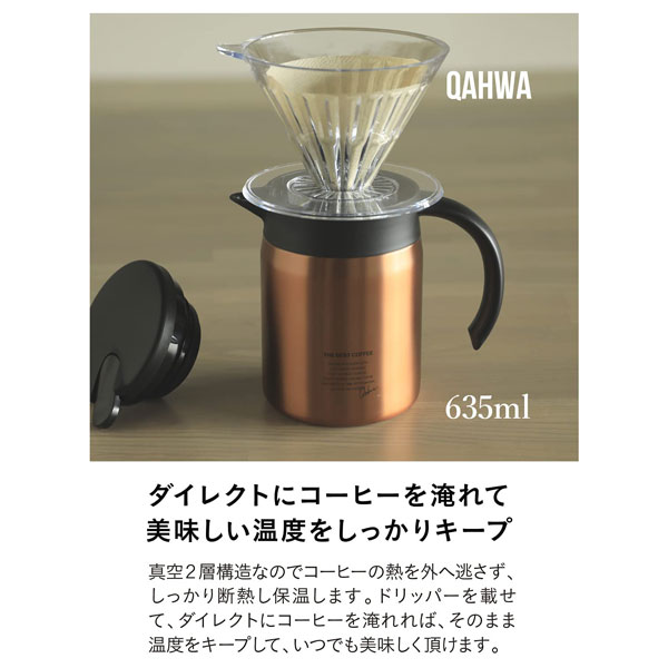 サーバー内面はテフロン加工を施しているので、汚れが付きにくく、落ちやすいので衛生的。 飲み物の匂い移りなどがしにくく、コーヒー本来の味と香りをお楽しみ頂けます。 ダイレクトにコーヒーを淹れて美味しい温度をしっかりキープ。真空2層構造なのでコーヒーの熱を外へ逃さず、しっかり断熱し保温します。 ドリッパーを載せて、ダイレクトにコーヒーを淹れれば、そのまま温度をキープして、いつでも美味しく頂けます。