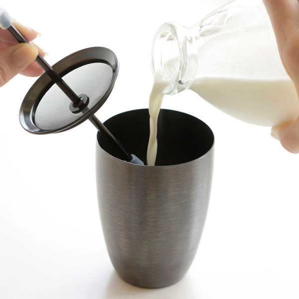 牛乳を注ぎ付属のメッシュネットをセットして、フタをして20秒上下にシェイクするだけで、ふわふわミルクの完成です。 なめらかな口当たりのクリーミーな泡立ちです。
