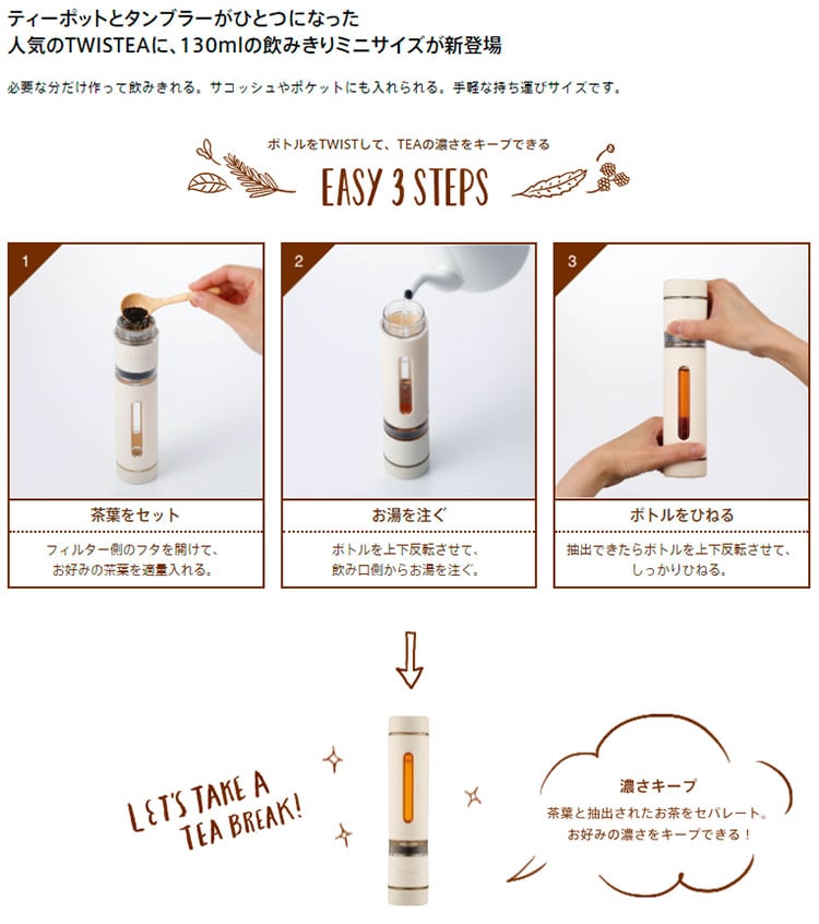 ティーポットとタンブラーがひとつになった人気商品のビタントニオ ツイスティープラスの妹分、130mlの飲みきりミニサイズです。 必要な分だけ作って飲みきれる。サコッシュやポケットにも入れられる。手軽な持ち運びサイズです。