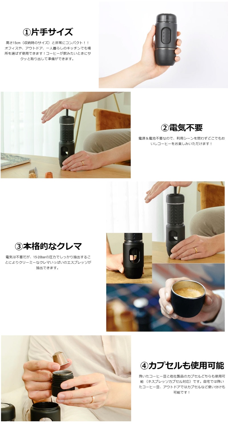 使用手順はシンプルで、10g程度の細挽のエスプレッソ用(深煎り)コーヒー豆や、ネスプレッソカプセルコーヒーをセットし、85度以上のお湯を80mlほど注いでから、15回ほどポンピングするだけでクレマ立つクリーミーで風味豊かなエスプレッソコーヒーが抽出されます。持ち運びがしやすく、手軽に短時間で完成するので、オフィスやアウトドアなどで手軽に使うことができます。