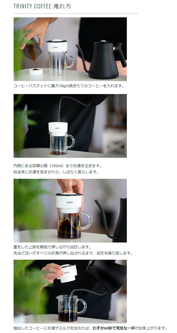 オーストラリア生まれのTrinity Zero(トリニティゼロ)は特許取得済みのコーヒープレスで、コーヒーを短時間で作成します。 たった60秒。ドリップ以上エスプレッソ未満で楽しみ方も多様です。