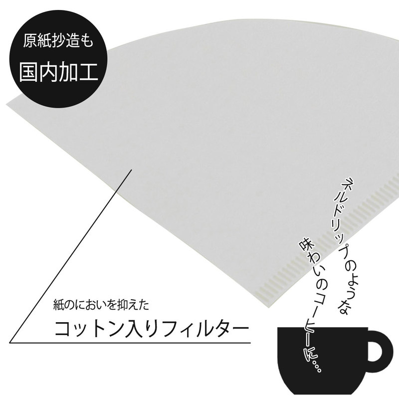 普通のペーパーフィルターと変わりないように見えますが、原料にコットンリンターパルプ(木綿繊維)も使用。 紙臭を抑え、ネルドリップのような味わいが楽しめるペーパーフィルターです。